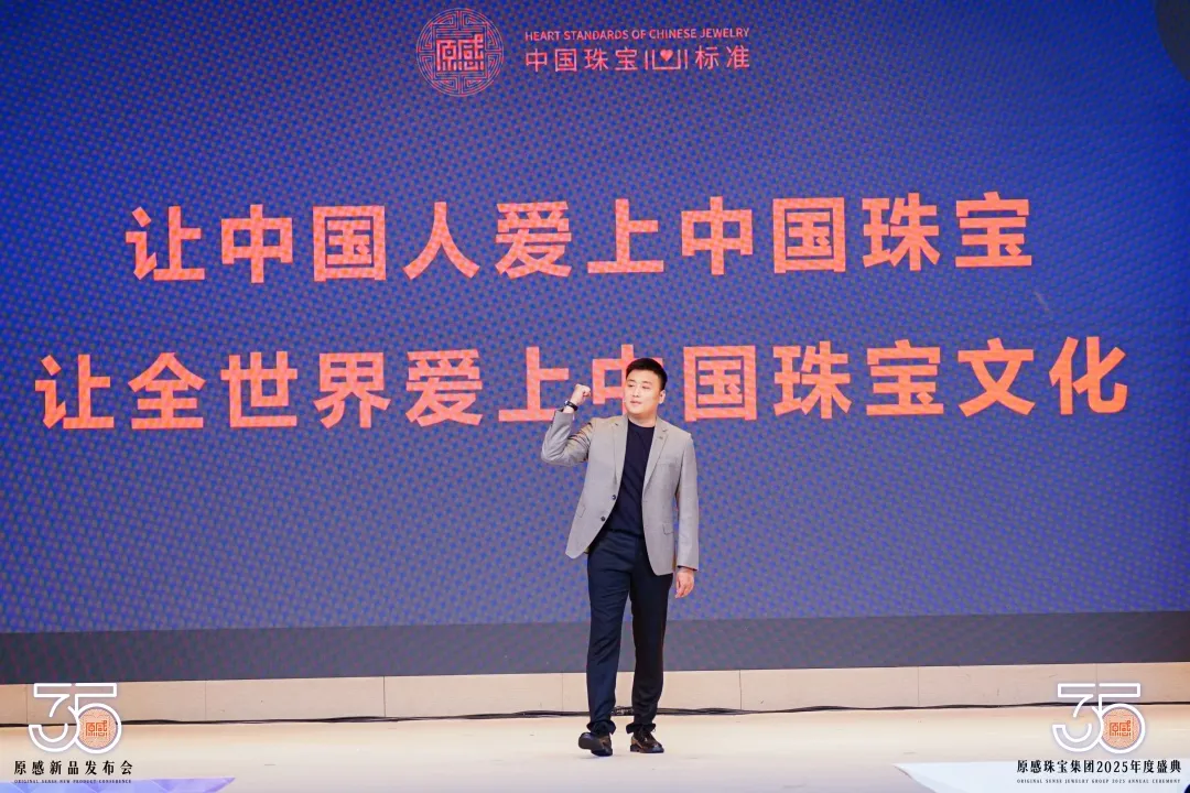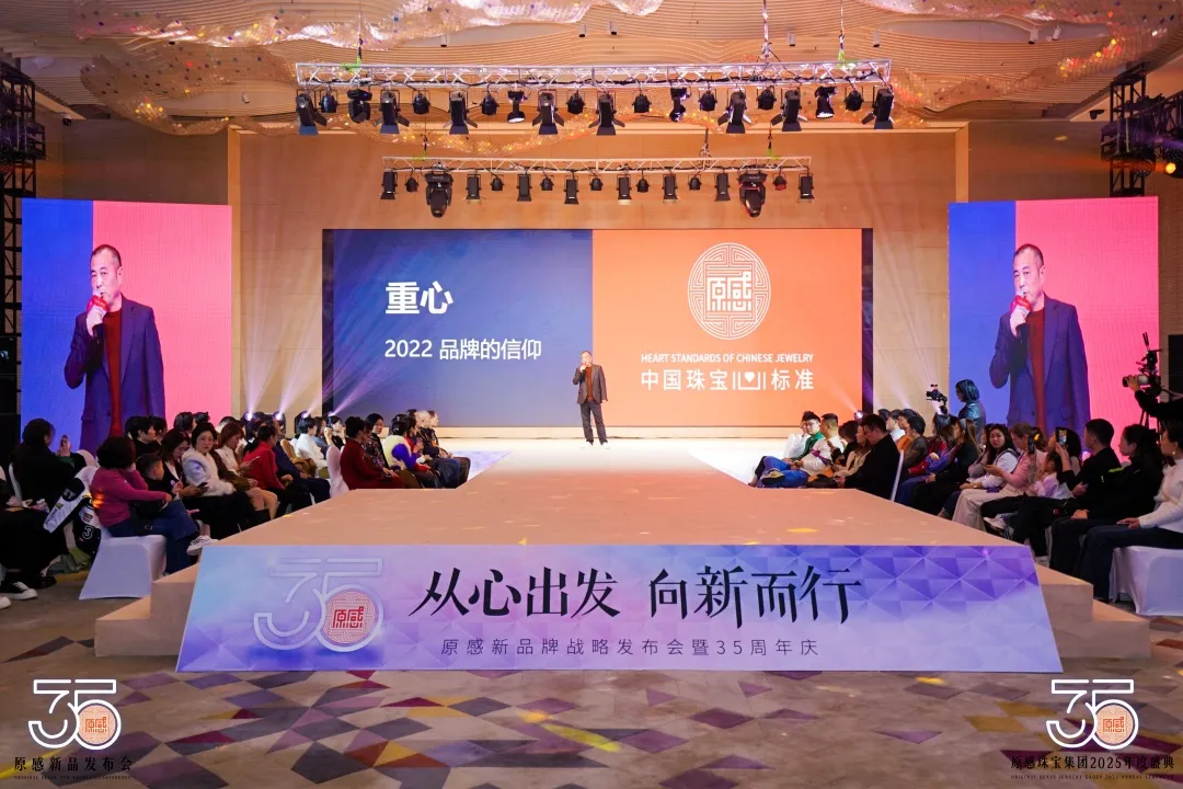 活动现场,原感珠宝创始人梁运柱发表了激情洋溢的35周年主题演讲,深情回顾了品牌自1990年创立以来的风雨兼程与辉煌成就。