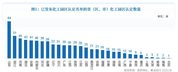 根据赛迪顾问统计,截至2024年7月31日,全国共有30个省(区、市)发布化工园区认定名单,共认定化工园区745家,其中,山东以84家位居首位,浙江、河南、湖北、安徽等省份均在40家以上;内蒙古、河北、新疆等18余个省(区)认定数量介于10-40家,形成中部稳定支撑带。